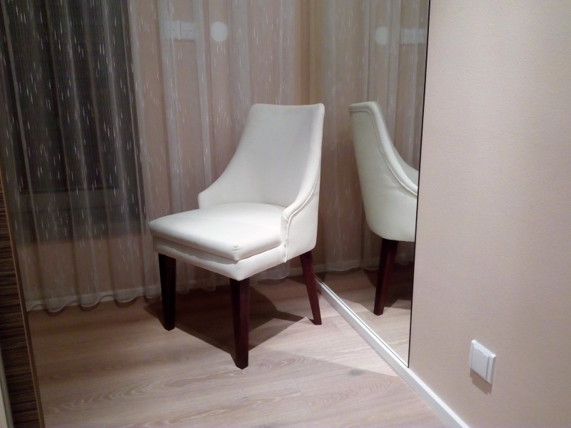Der gepolsterte Stuhl mit komfortablem, festem Sitz und eleganter Armlehne kann an der Rückenseite mit einem farbigen Polsterband - Paspel - verziert werden.