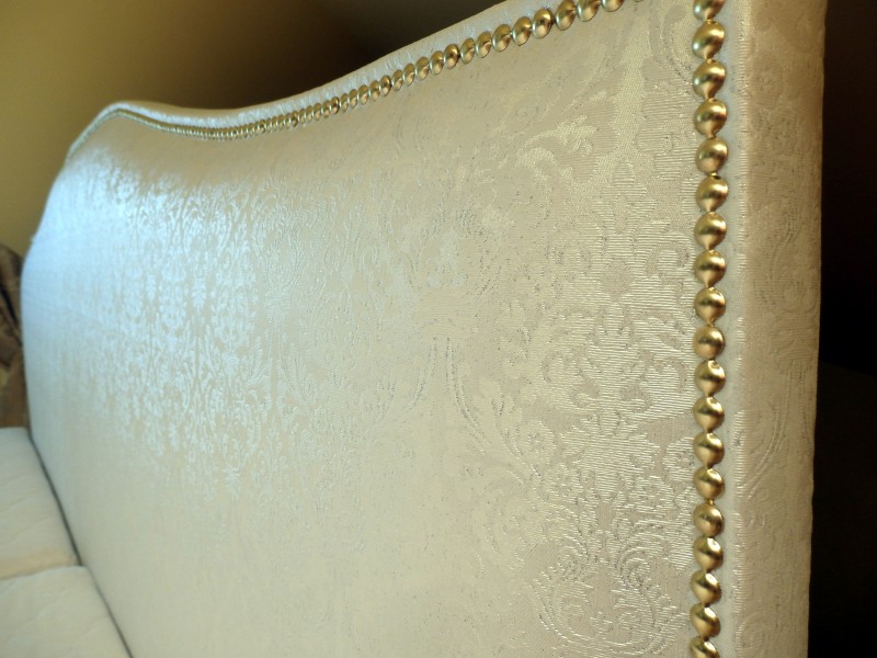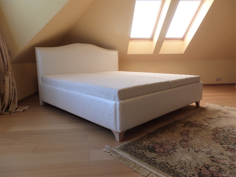 Das stilvolle Bett mit elegant geformter und gepolsterter Bettstirn, welches mit Metallnägeln geschmückt ist, passt Dank dem niedrig gebauten Bettkopfteil hervorragend im Dachgeschoßräume - in private Dachschlafzimmer, Mädchenzimmer sowie in stilvolle Hotel- und Wellnessräume.
