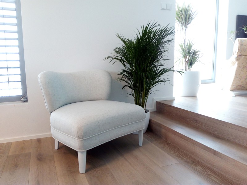Ein moderner Sessel mit abgesenkter Rückenlehne kann auf den ersten Blick unscheinbar wirken, es reich jedoch aus, das farbige Bezugsmaterial zu verwenden, und der Stuhl hellt den gesamten Innenraum auf.